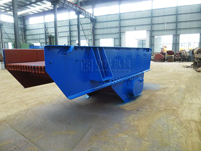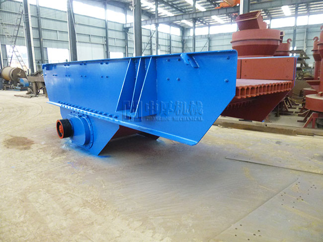 振動給料機工作時,通過電機驅動,使兩偏心軸旋轉,從而產生巨大合成的直線激振力,使機體在支承彈簧上作強制振動,物料則以此振動為動力,在料槽上作滑動及拋擲運動,從而使物料前移而達到給料目的。