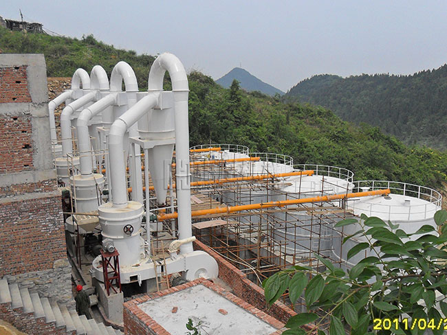 磨碎后的物料通過空心軸頸排出,送入選粉機,經選粉機進行分級,符合細度的物料隨氣流進入料倉,即成品。細度不夠的通過空氣斜槽送入球磨機再進行球磨。在磨機內被磨物料中有含水量,研磨時產生熱量導致磨室內氣體蒸發改變了氣流量,同時由于整機各管道結合處密封不嚴等,外界氣體被吸入,使循環氣流風量增加,為此通過調整風機來達到氣流的平衡,并將多余的氣體導入脈沖除塵器內,把余氣帶入的細粉子收集下來,余氣被凈化后排出。整條磨粉生產線的粉塵排放均達到環保要求。
